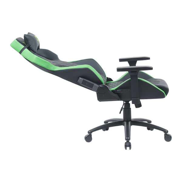 các chair allows for a reclining range of 90° to 155°, providing versatile seating options from intense gaming sessions to a more relaxed, laid-back position. The handle can be pulled out to unlock the reclining mechanism, and by pushing the handle back in, you can easily lock it in place at your desired angle. This feature ensures that gamers can transition smoothly between gaming and resting.